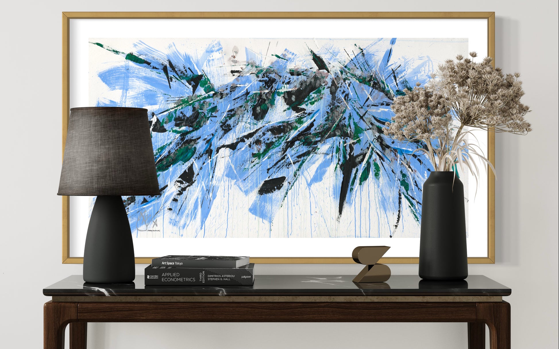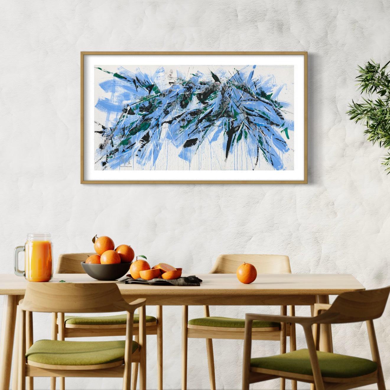Fine Art print on matte French Cotton Rag Paper 310gsm. Limited edition prints (16) reproduced from an Original Acrylic and Mixed Media on Canvas. The vibrancy of BLUE TONGUE is in the movement of creatures captured on the canvas. The birds and the lizards either rising or dipping make this a versatile signature piece - in cornflower blues and racing greens.