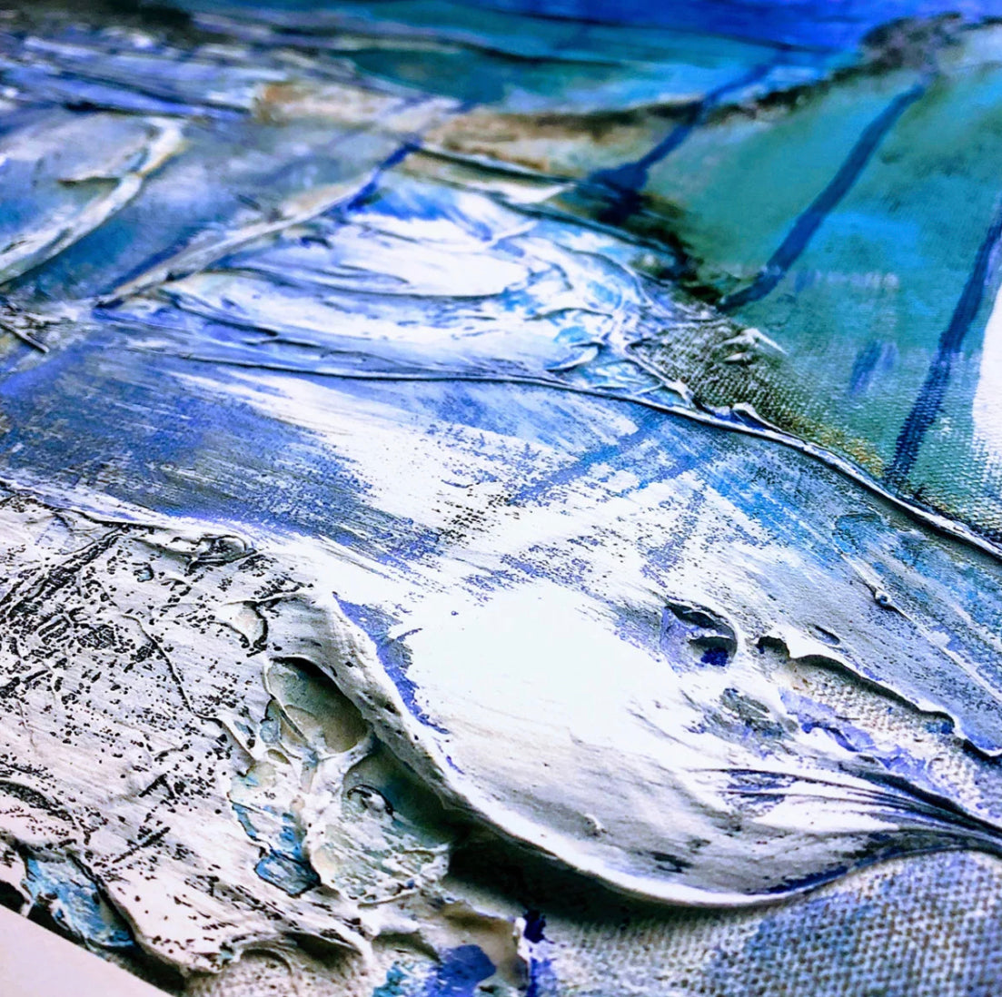 Fine Art print on matte French Cotton Rag Paper 310gsm. Limited edition prints (16) reproduction from an Original Acrylic and Mixed Media on Canvas. SEA DOGS challenges the eye to search out the creatures within. Vibrant and constantly changing, this piece is unusual as it captures movement on a static square canvas. Ocean blues and turquoise capturing the colour tones of a the reef and atoll - with liquid copper acid wash patina.