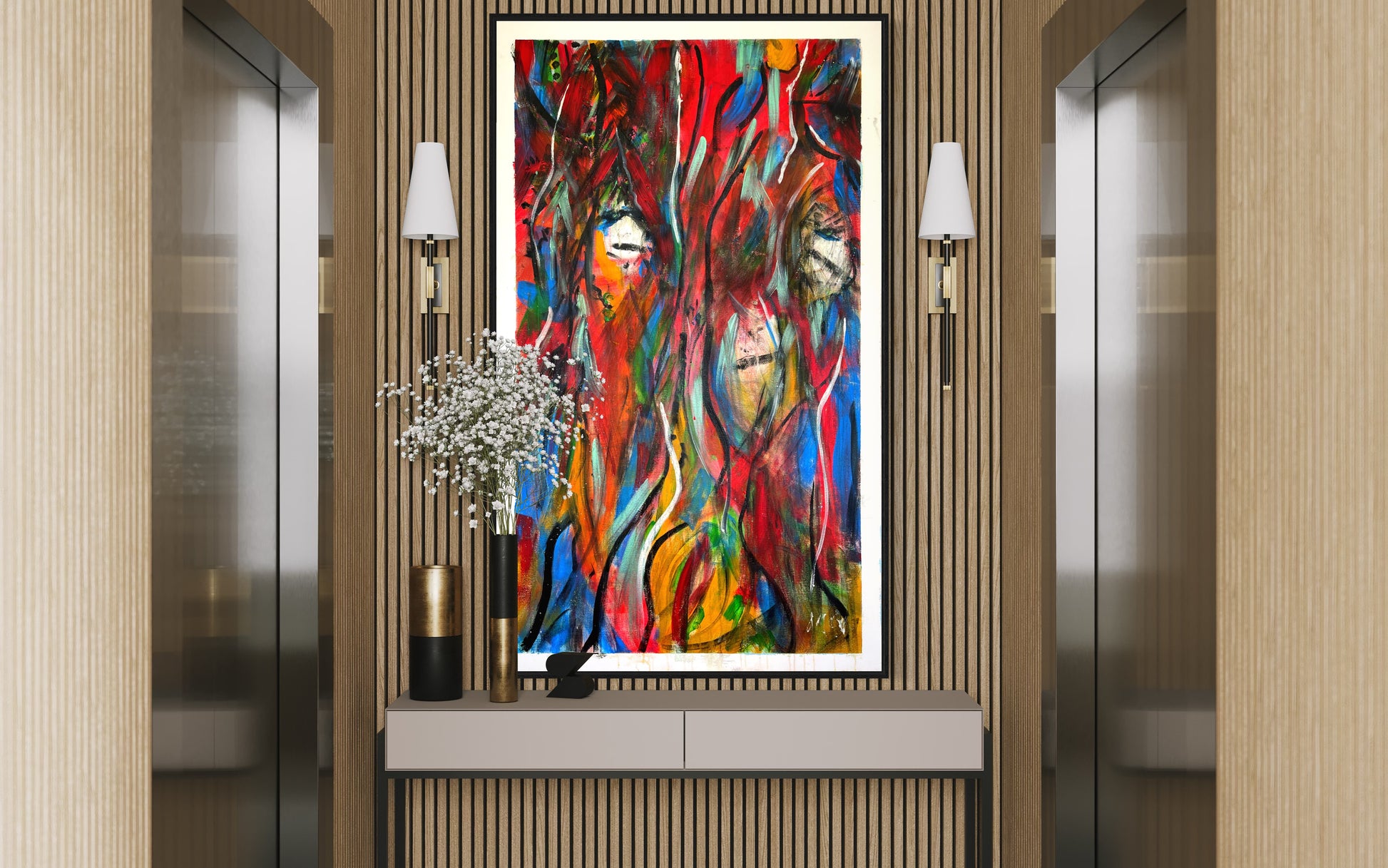 Original Oil on Canvas. This is a one of a kind early work exploring painting with oils. The colours are akin to the vibrancy in Geoffrey’s acrylic on canvas however the oils have certain richness and luster sophisticated reds, blues, mustard yellows and greens. This work is a family piece based on the narrative of Geoff’s family of three navigating their way.