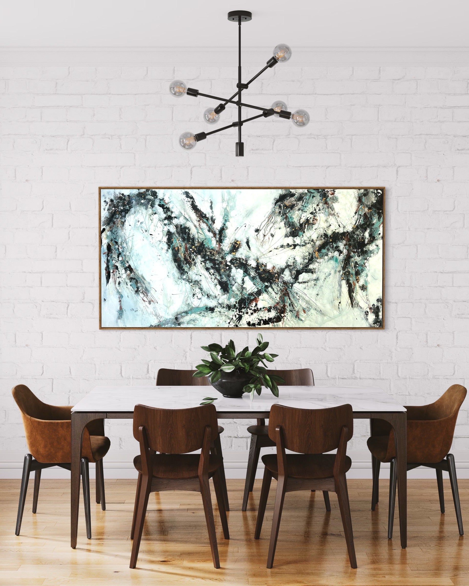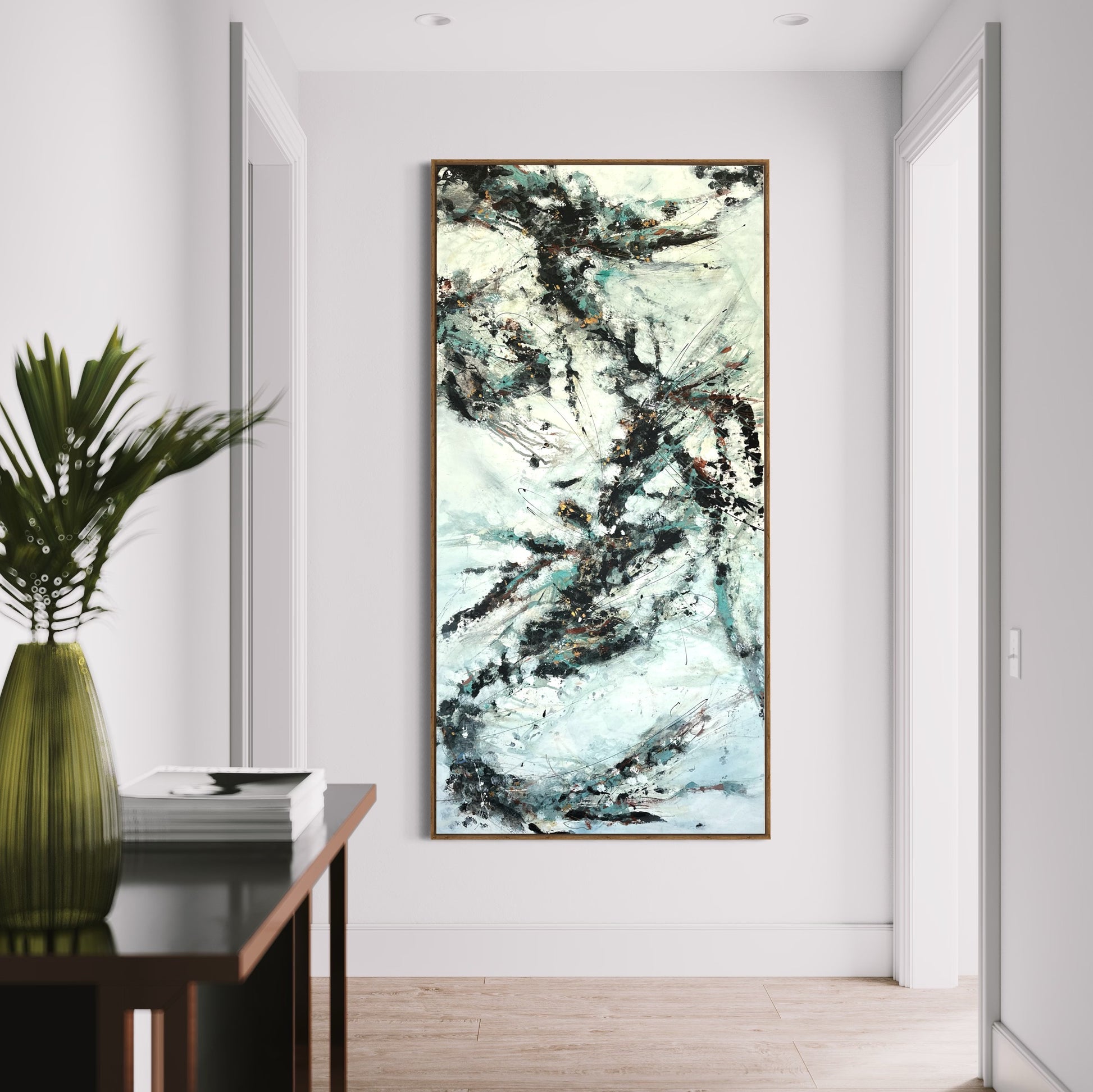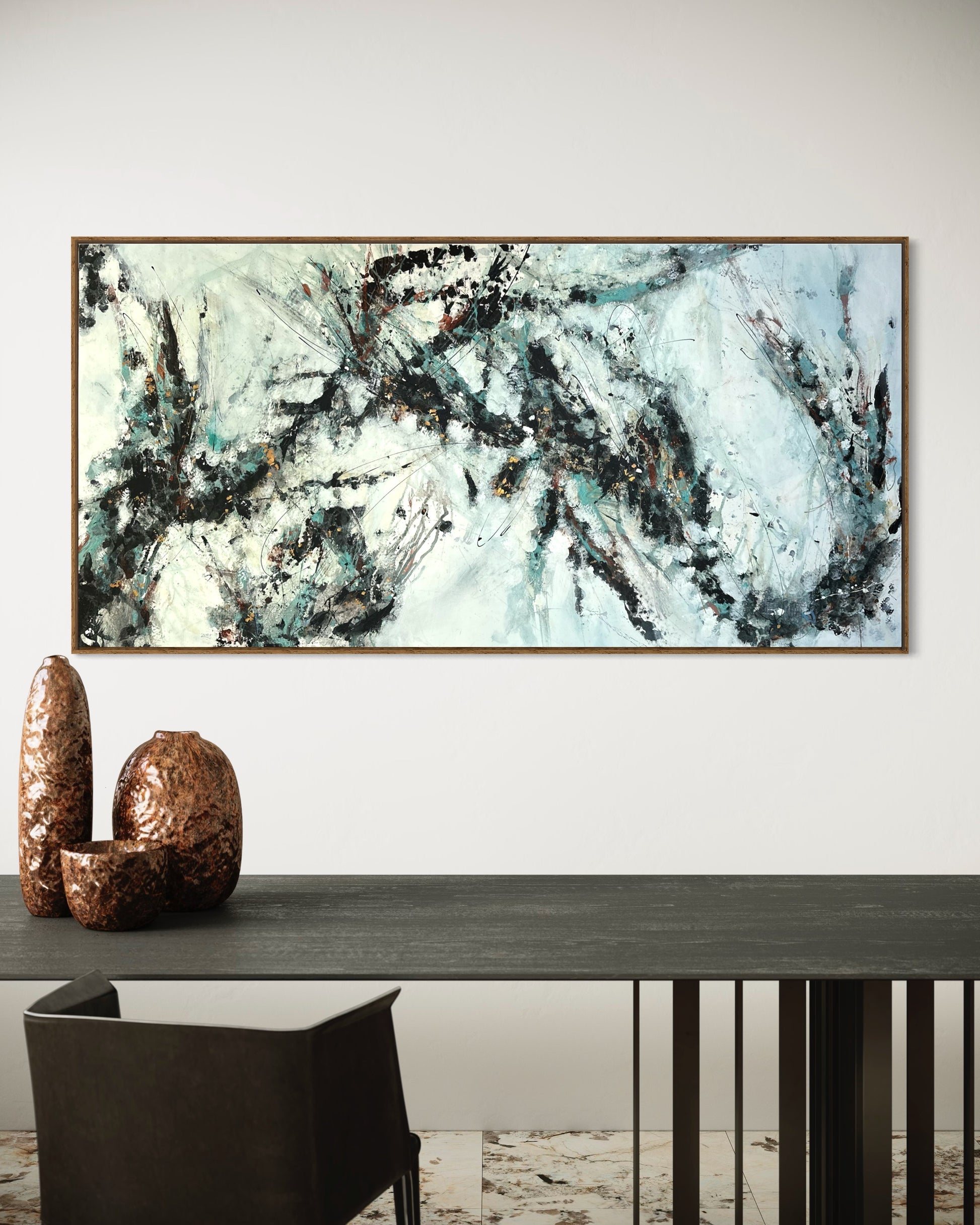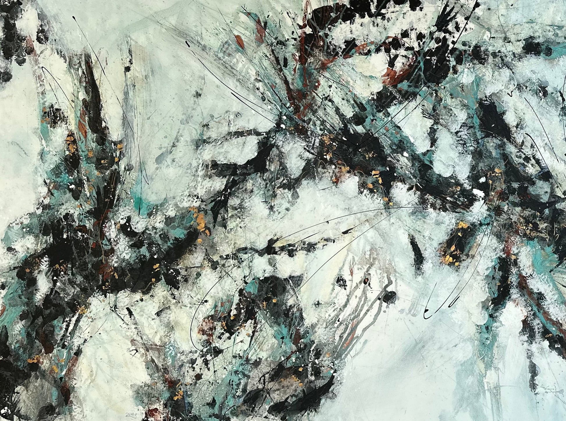 Acrylic and Mixed Media on Canvas. The Falcon & the Snowman illustrates the mysterious dance between two foes. Fluid and kinetic movement captured on canvas. Ocean blues and turquoise with luminous liquid copper acid wash patina.