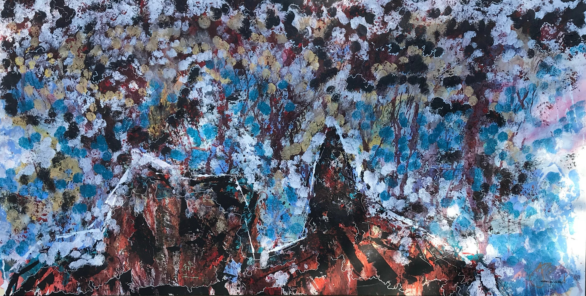 Acrylic and Mixed Media on canvas. Of the earth and of the sky and of the water THE LUCKY COUNTRY picks up on eternal Australian colours and textures. Yularnga is Gulf Country - the Gulf of Carpentaria. This painting celebrates our northern states and their perilous position over the years as the first port of call for elusive frenemies - past present and future. Raining gold coins - what is our worth ?
